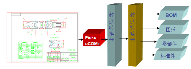 ? ? ? 原AutoCAD圖紙的歸檔和數(shù)據(jù)提取是一直困擾企業(yè)信息化實(shí)施過程中的一個問題?!惫埠谩痹谶@方面有非常好的表現(xiàn),我們提供了一個獨(dú)立于AutoCAD和PLM系統(tǒng)的PickUpCom組件,通過PLM調(diào)用該組件自動提取AutoCAD圖紙中的歸檔信息(如圖號、名稱等)及產(chǎn)品結(jié)構(gòu)數(shù)據(jù)(裝配圖的明細(xì)表信息)。