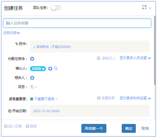 當(dāng)團(tuán)隊任務(wù)的開關(guān)打開后,我們在分配任務(wù)的時候就可以選多人,點確定后就可以創(chuàng)建一個團(tuán)隊任務(wù)。