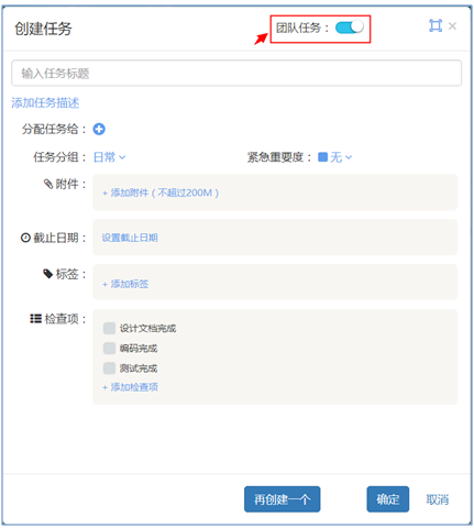 創(chuàng)建團(tuán)隊任務(wù)的入口和方法同上面的任務(wù)創(chuàng)建,不同的是創(chuàng)建團(tuán)隊任務(wù)需要把團(tuán)隊任務(wù)的開關(guān)打上,如下圖紅色框線區(qū)域顯示。