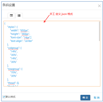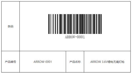 “styles”: { “width”: “650px”, “height”: “360px”, “font-size”: “14px”, “text-align”: “center” }, “colgroup”: [ “14%”, “36%”, “14%”, “36%” ], “rowgroup”: [ “70%”, “30%” ], “thead”: [], “tbody”: [ [ { “type”: “text”, “value”: “條碼” }, { “span”: [ 1, 3 ], “type”: “attr-barcode”, “value”: [ { “type”: “attr”, “value”: “S_GDS_CODE” } ], “compose”: true } ], [ { “type”: “text”, “value”: “產(chǎn)品編號(hào)” }, { “type”: “attr”, “value”: “S_GDS_CODE” }, { “type”: “text”, “value”: “產(chǎn)品名稱” }, { “type”: “attr”, “value”: “S_GDS_NAME” } ] ] } |