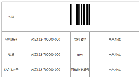 “styles”: { “width”: “650px”, “height”: “360px”, “font-size”: “14px”, “text-align”: “center” }, “colgroup”: [ “14%”, “36%”, “14%”, “36%” ], “rowgroup”: [ “25%”, “25%”, “25%”, “25%” ], “thead”: [], “tbody”: [ [ { “type”: “text”, “value”: “條碼” }, { “span”: [ 1, 3 ], “type”: “attr-barcode”, “value”: [ { “type”: “attr”, “value”: “S_B_CODE” }, { “type”: “text”, “value”: “-” }, { “type”: “attr”, “value”: “S_B_SUPPLIER” } ], “compose”: true } ], [ { “type”: “text”, “value”: “物料編碼” }, { “type”: “attr”, “value”: “S_ITEM_CODE” }, { “type”: “text”, “value”: “物料名稱” }, { “type”: “attr”, “value”: “S_ITEM_NAME” } ], [ { “type”: “text”, “value”: “數(shù)量” }, { “type”: “attr”, “value”: “S_ITEM_CODE” }, { “type”: “text”, “value”: “單位” }, { “type”: “attr”, “value”: “S_ITEM_NAME” } ], [ { “type”: “text”, “value”: “SAP批次號(hào)” }, { “type”: “attr”, “value”: “S_ITEM_CODE” }, { “type”: “text”, “value”: “可追溯批量號(hào)” }, { “type”: “attr”, “value”: “S_ITEM_NAME” } ] ] } |