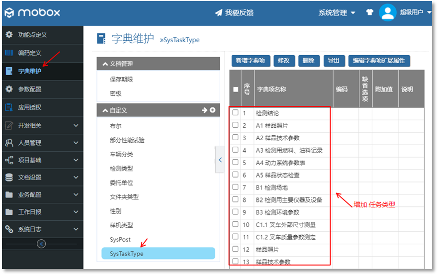 - 字典里面增加:SysTaskType,里面定義任務(wù)類型的名稱