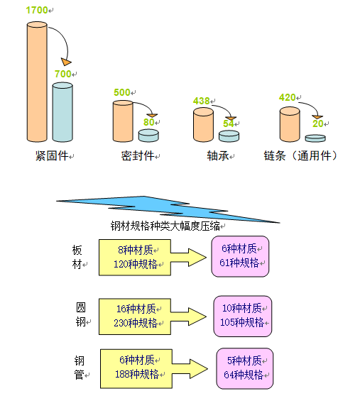 下圖是國內(nèi)某叉車集團(tuán)在實(shí)施PDM系統(tǒng)前后對標(biāo)準(zhǔn)件、通用件、材料規(guī)格數(shù)量的一個對比。