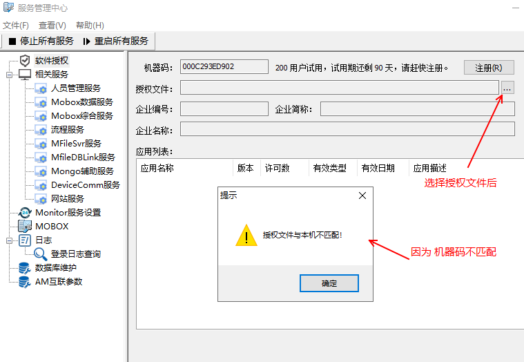 2)授權(quán)文件的機器碼與當前服務(wù)器的機器碼不一致(注冊的時候會出現(xiàn))