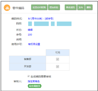 上圖所示,零件編碼只允許“銷售部”“開發(fā)部”使用,申請編碼時(shí)需要由“綜合調(diào)度員”進(jìn)行審核