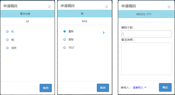 在上圖中最右邊一頁是當(dāng)所有的碼段都已經(jīng)設(shè)置完畢后出現(xiàn)的申請頁面,可以輸入申請的編碼的個(gè)數(shù)和原因,如果申請需要審核在這個(gè)頁面可以選擇審核人。