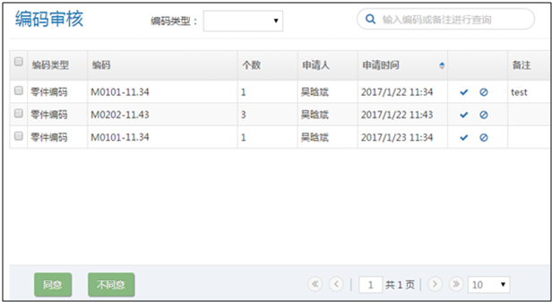 編碼審核就是對提交上來的編碼申請進(jìn)行判斷是否允許申請者使用的過程。一般是有企業(yè)的管理人員擔(dān)當(dāng)審核這樣的角色。該功能點(diǎn)沒有太多的概念,僅僅就是一個(gè)列表顯示所有需要操作這審核的編碼申請,點(diǎn)中后進(jìn)行“同意”“不同意”操作,頁面如下圖所示。