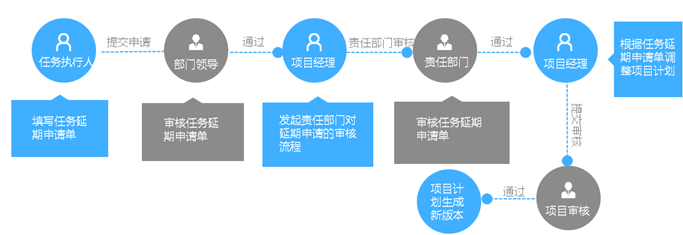 復(fù)雜計(jì)劃變更流程是一個比較嚴(yán)謹(jǐn)?shù)挠?jì)劃變更過程,首先計(jì)劃的變更肯定是由某一個任務(wù)或多個任務(wù)的延期造成計(jì)劃無法滿足預(yù)期,需要變更。因此,首先任務(wù)的執(zhí)行人提出任務(wù)延期申請,并說明原因、指出造成延期的責(zé)任部門,要求延期多少天。這些申請首先會到執(zhí)行人所在的部門,得到部門負(fù)責(zé)人的認(rèn)可,然后這些申請才會到項(xiàng)目經(jīng)理。由項(xiàng)目經(jīng)理發(fā)起多部門的延期任務(wù)申請確認(rèn),通過后由項(xiàng)目經(jīng)理根據(jù)任務(wù)延期申請單里的信息改進(jìn)項(xiàng)目計(jì)劃,然后走審核流程通過后項(xiàng)目計(jì)劃變更完成