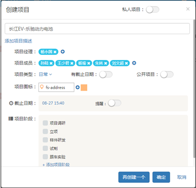 項(xiàng)目名稱、項(xiàng)目內(nèi)容描述、項(xiàng)目周期、項(xiàng)目經(jīng)理、項(xiàng)目成員、項(xiàng)目階段、項(xiàng)目內(nèi)權(quán)限配置、項(xiàng)目內(nèi)相關(guān)審核流程配置等。設(shè)置好后,保存后項(xiàng)目建立。項(xiàng)目成立后系統(tǒng)會通過我們的企業(yè)內(nèi)部通訊系統(tǒng)項(xiàng)項(xiàng)目成員發(fā)送消息進(jìn)行提醒。