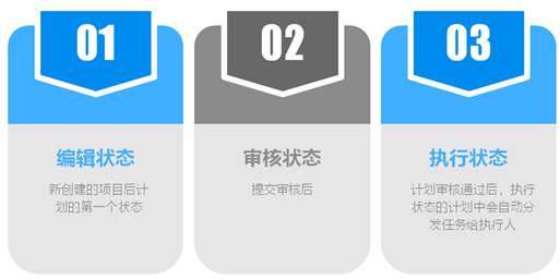 項(xiàng)目計(jì)劃中創(chuàng)建的任務(wù)并不能馬上執(zhí)行,必須要通過審核后系統(tǒng)才能觸發(fā)任務(wù)下達(dá)。項(xiàng)目計(jì)劃有以下3個狀態(tài)